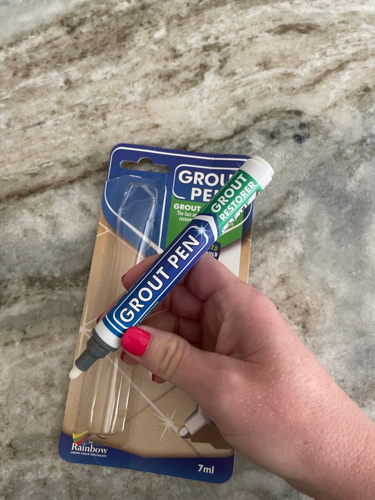 2. Prime the Grout pen. To activate the paint within the pen, remove the cap and gently pump the dry white tip about 20-30 times until fully saturated. I used the package the pen came inside to catch the excess paint. You could also use a thick piece of paper or paper towels but be careful because it could bleed through. I also tested the ink flow on the same packaging to get a feel for how the paint will flow before applying it to the grout.